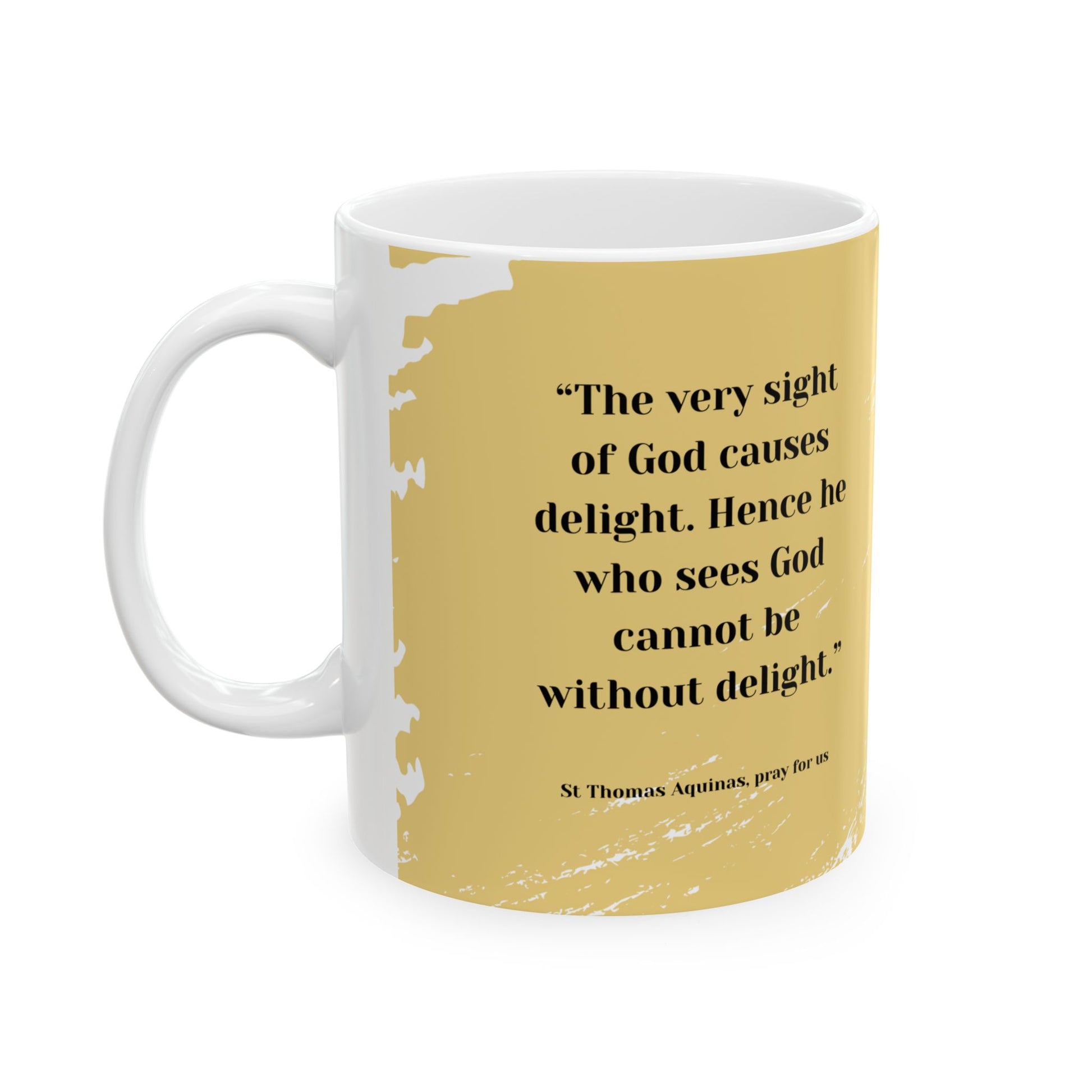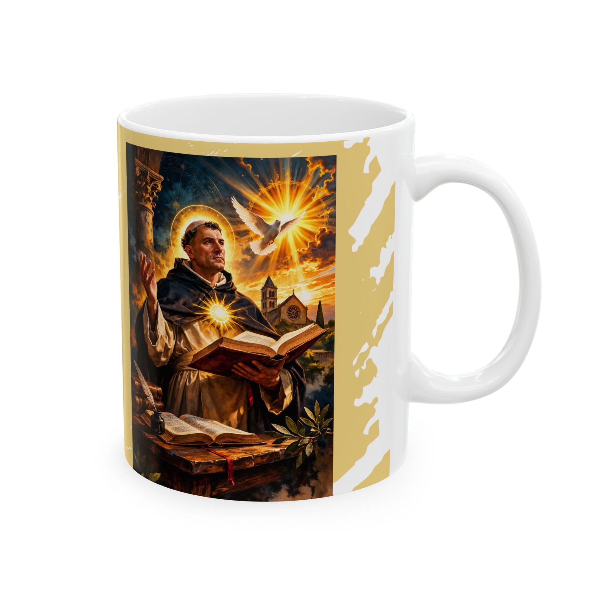 Start your morning with a moment of silent prayer. This beautifully designed coffee cup features the beloved image of St. Thomas Aquinas alongside his timeless words: